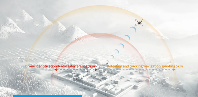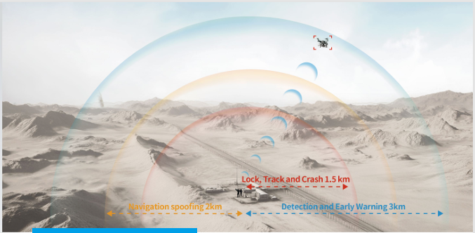 Detección por radio: 5 km (basado en el modo SRRC del DJI Mavic 3, potencia de señal de aproximadamente 20 dBm a 2,4 GHz y de aproximadamente 30 dBm a 5,8 GHz, sin interferencias fuertes en condiciones de avistamiento). Detección visual y por radar: FPV de 7 pulgadas: 3,5 km; Minidrones y microdrones (DJI Mavic 3): 5 km. Drones pequeños y medianos (DJI M300): 7 km Análisis de protocolo: 3 km (basado en el modo SRRC del DJI Mavic 3, con una potencia de señal de aproximadamente 20 dBm a 2,4 GHz y de aproximadamente 30 dBm a 5,8 GHz, sin interferencias fuertes en condiciones de avistamiento) Interferencia de radiofrecuencia: 3 km (modo SRRC basado en el DJI Mavic 3, modelo típico con una potencia de señal de aproximadamente 20 dBm a 2,4 GHz y de aproximadamente 30 dBm a 5,8 GHz, y una distancia entre el piloto del dron y el dispositivo de interferencia de 6 km) Suplantación de navegación: 5 km.