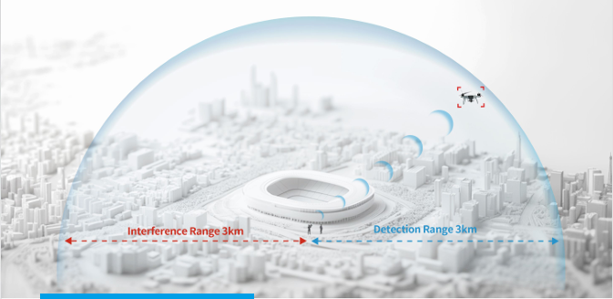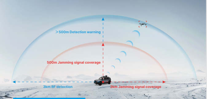 Detección por radio: 5 km (basado en el modo SRRC del DJI Mavic 3, potencia de señal de aproximadamente 20 dBm a 2,4 GHz y de aproximadamente 30 dBm a 5,8 GHz, sin interferencias fuertes en condiciones de avistamiento). Detección visual y por radar: FPV de 7 pulgadas: 3,5 km; Minidrones y microdrones (DJI Mavic 3): 5 km. Drones pequeños y medianos (DJI M300): 7 km Análisis de protocolo: 3 km (basado en el modo SRRC del DJI Mavic 3, con una potencia de señal de aproximadamente 20 dBm a 2,4 GHz y de aproximadamente 30 dBm a 5,8 GHz, sin interferencias fuertes en condiciones de avistamiento) Interferencia de radiofrecuencia: 3 km (modo SRRC basado en el DJI Mavic 3, modelo típico con una potencia de señal de aproximadamente 20 dBm a 2,4 GHz y de aproximadamente 30 dBm a 5,8 GHz, y una distancia entre el piloto del dron y el dispositivo de interferencia de 6 km) Suplantación de navegación: 5 km.